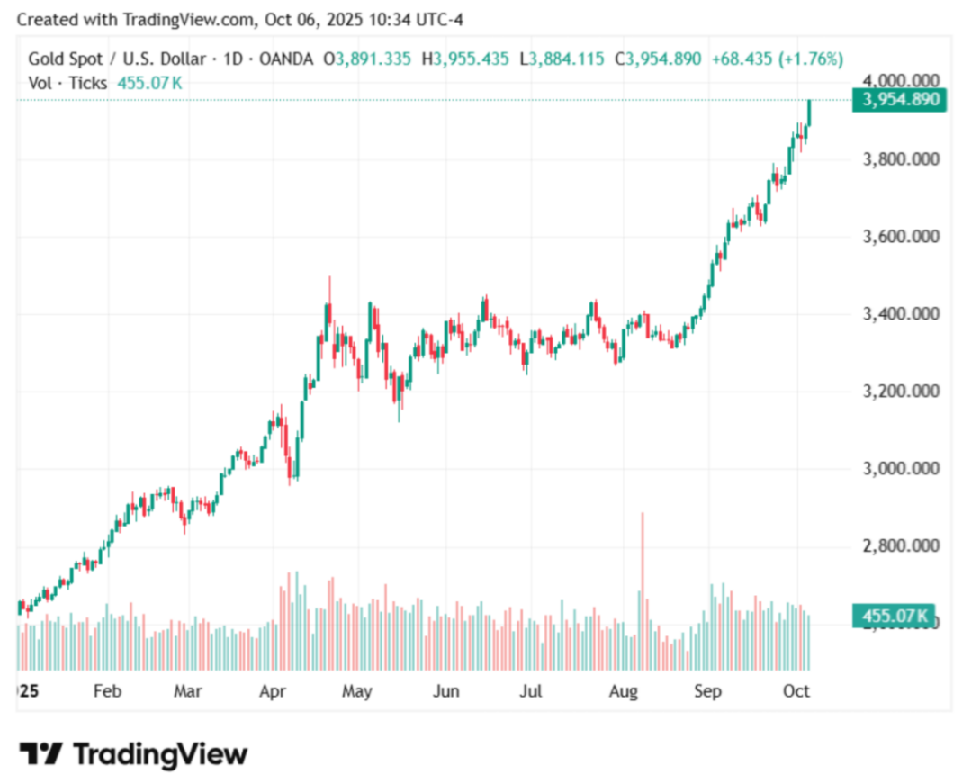 今年1月初至4月初,国际金价迅猛上涨行情,价格从年初的2600美元/盎司快速攀升至3400美元/盎司。随后,经历了4个月3300美元/盎司左右的横盘后,9月2日现货黄金再次突破3500美元/盎司关口,4天后(9月6日)冲上3600美元/盎司的历史新高,9月16日,伦敦现货黄金价格站上3700美元/盎司,9月23日一举冲破3800美元/盎司大关,10月6日,再度突破3900美元/盎司。10月6日晚些时候,纽约期金历史首次触及4000美元/盎司整数大关。